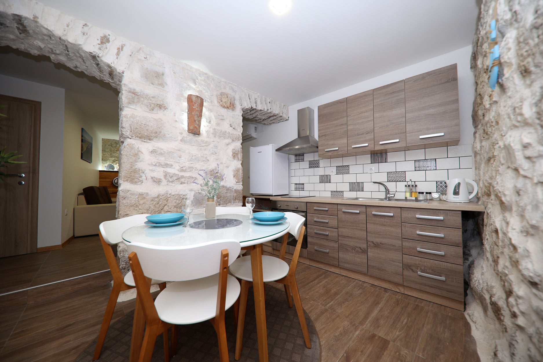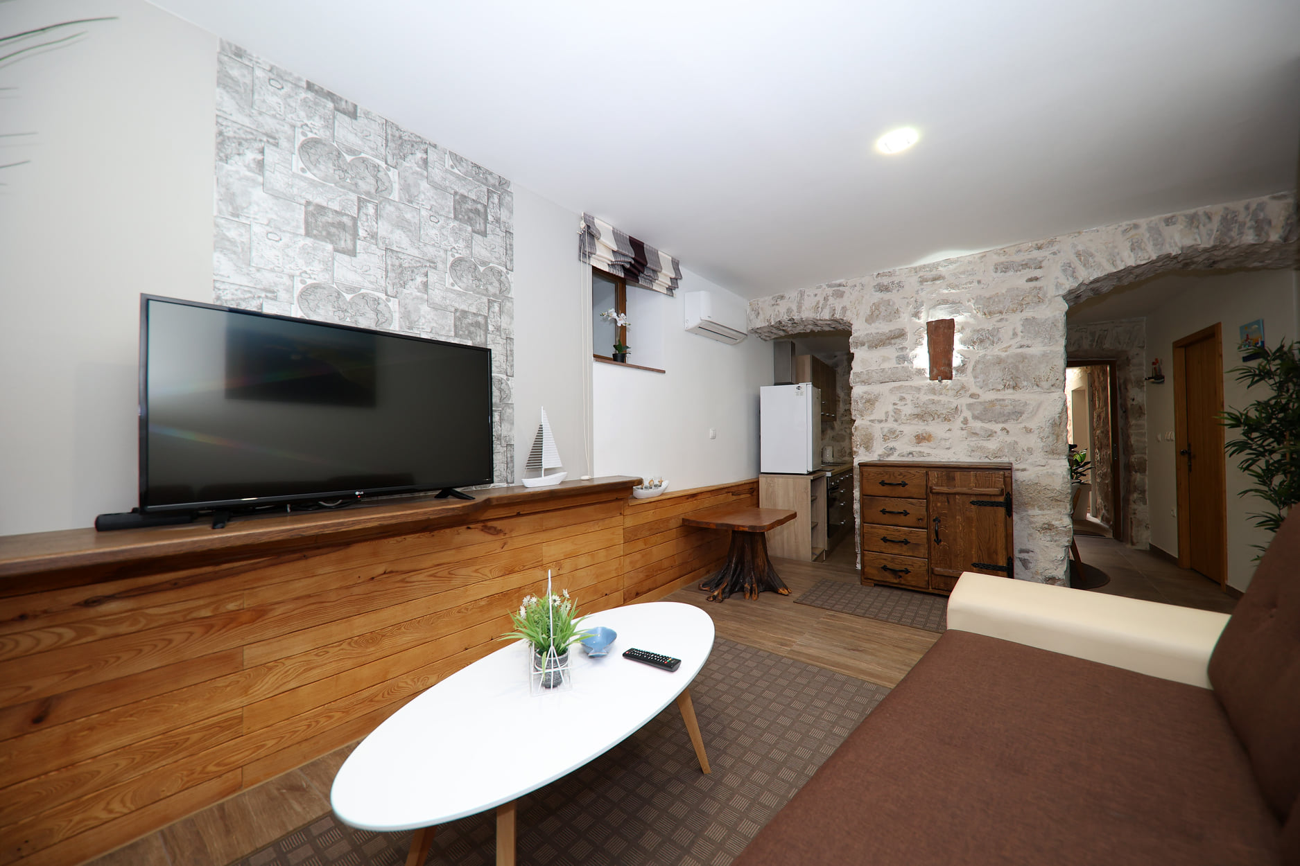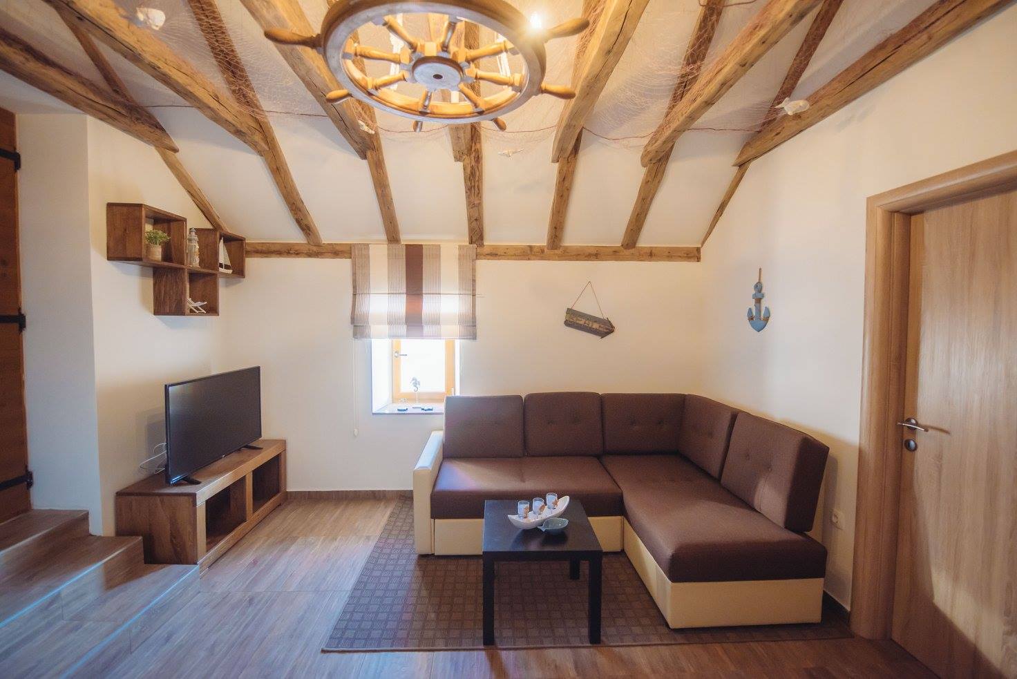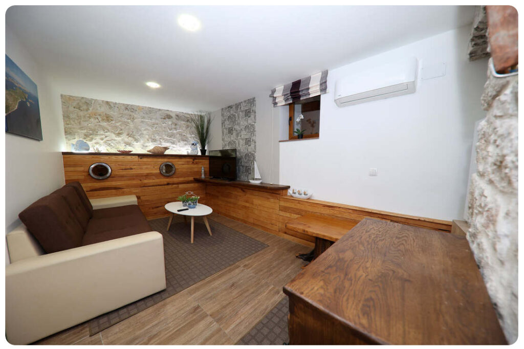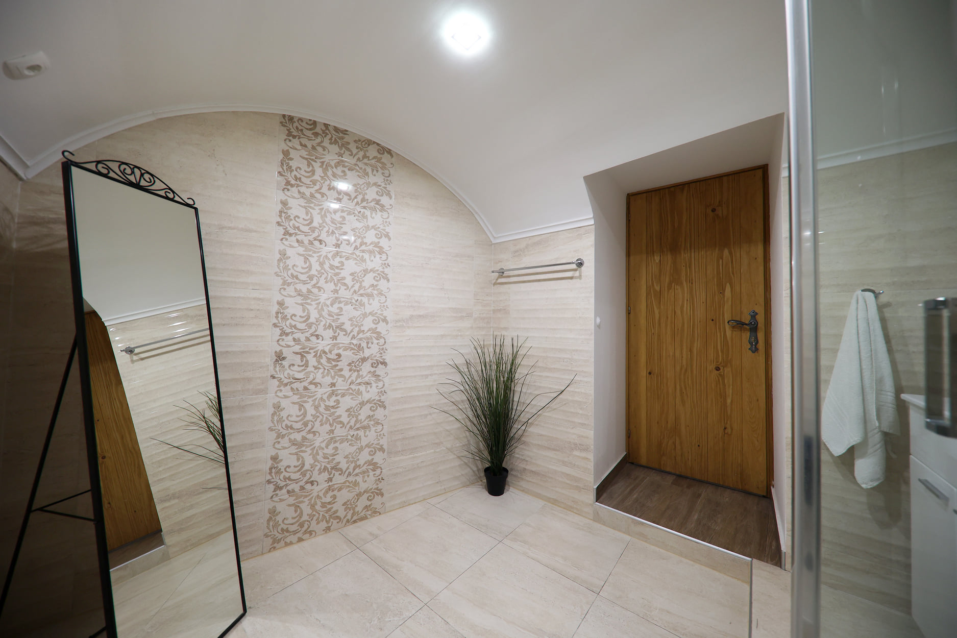 Apartment A2 is located on the ground floor, right at the entrance to the building. It has the most preserved stone arches and walls, thus conjuring a special atmosphere of living. It also has a special large and spacious arched bathroom with a large mirror. The living room has lots of wooden decorative wall elements and antique furniture.