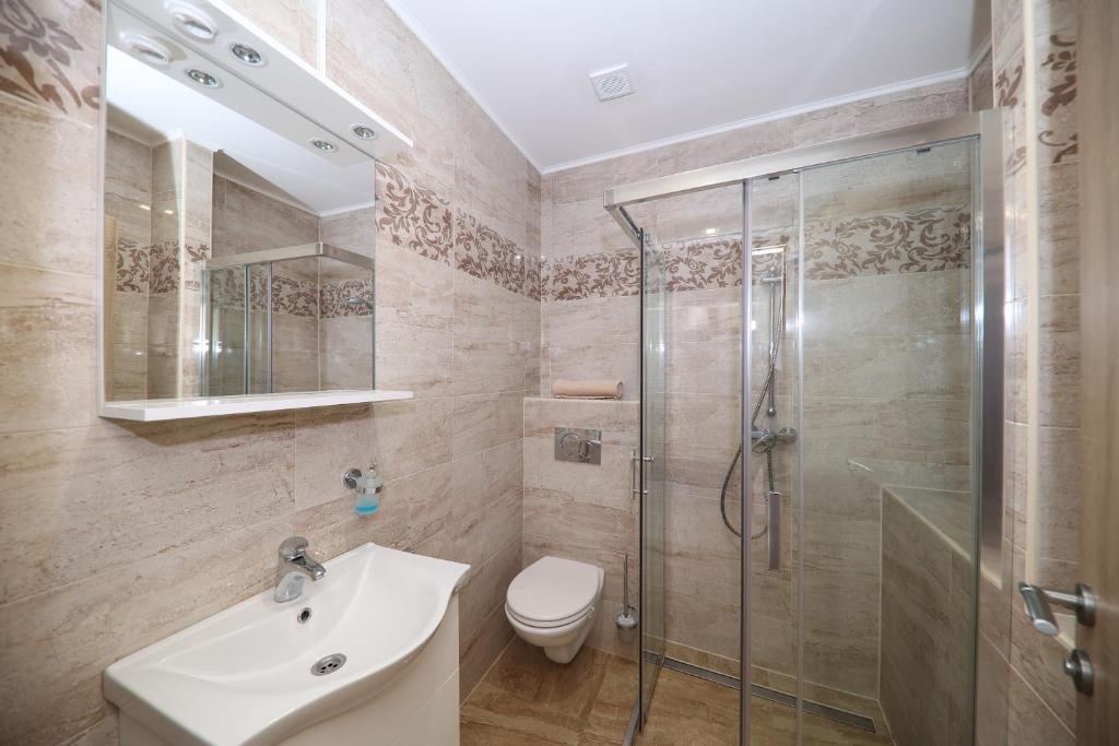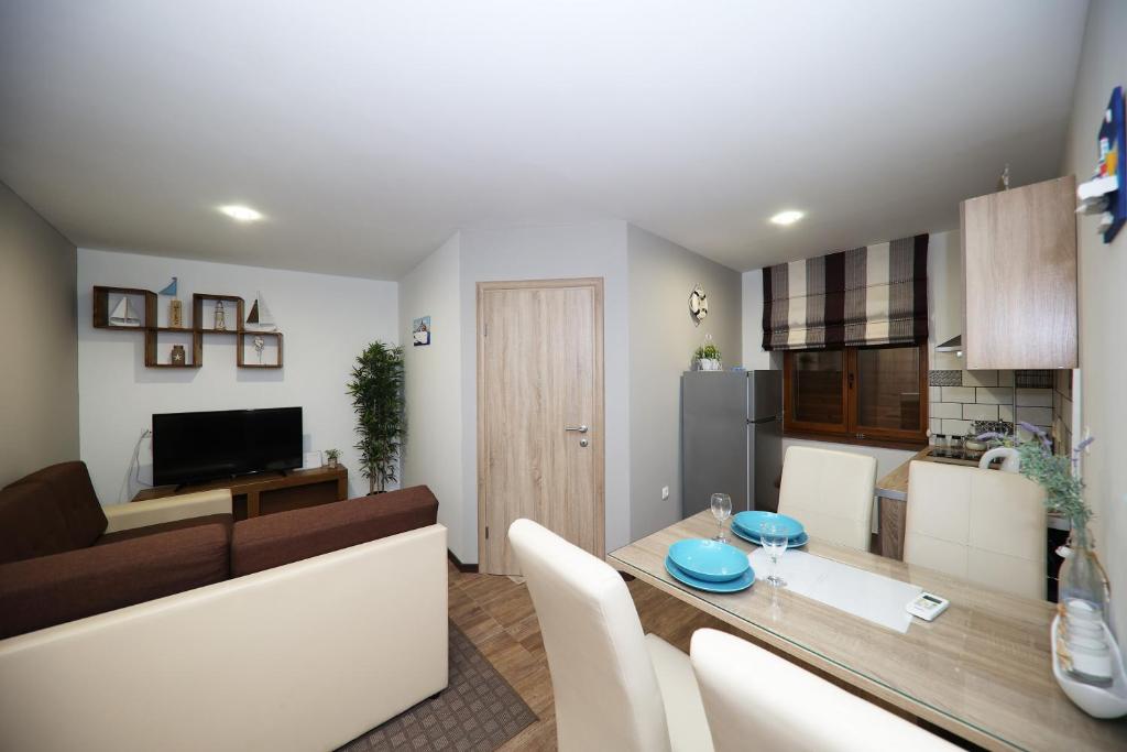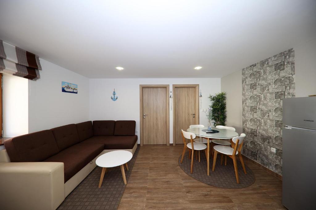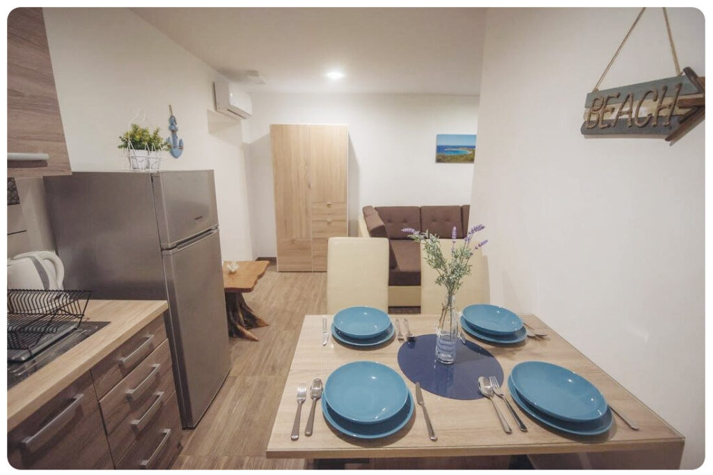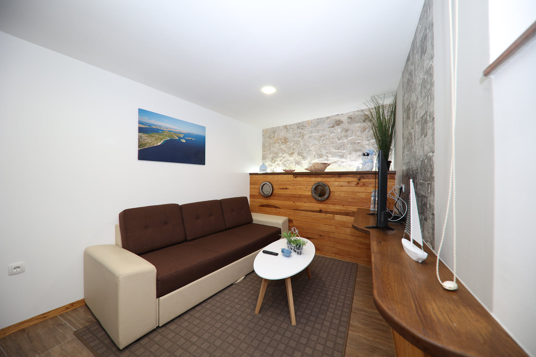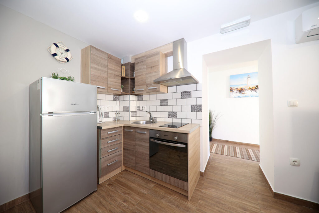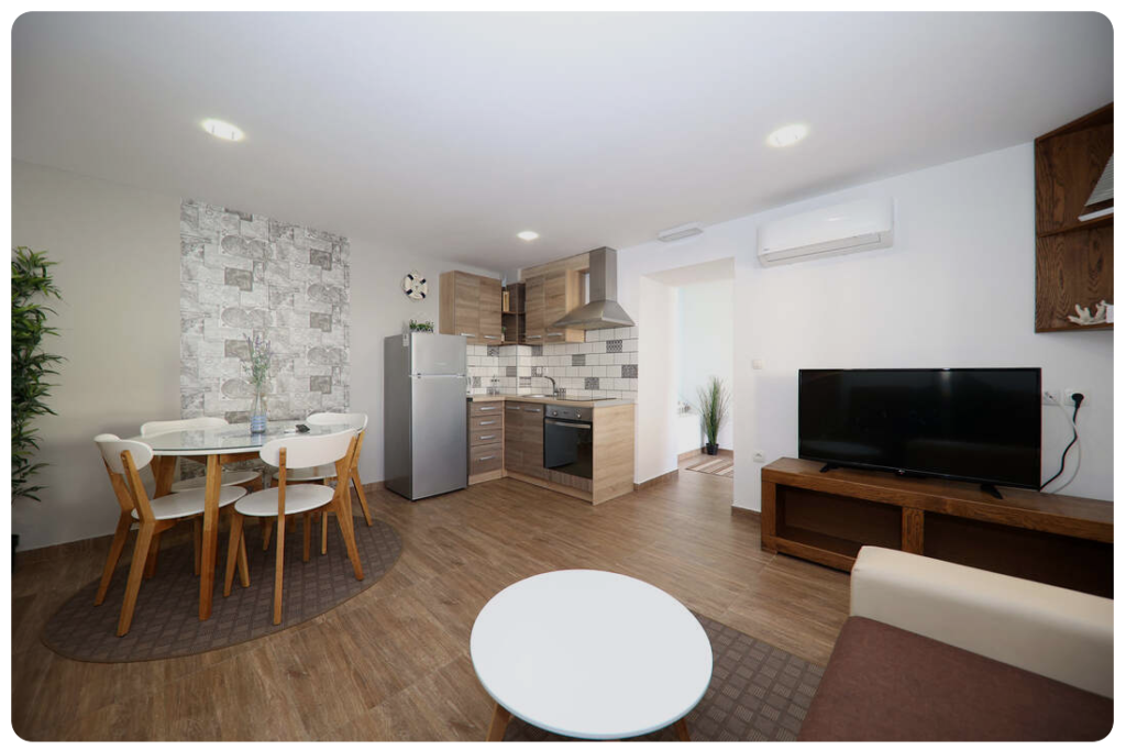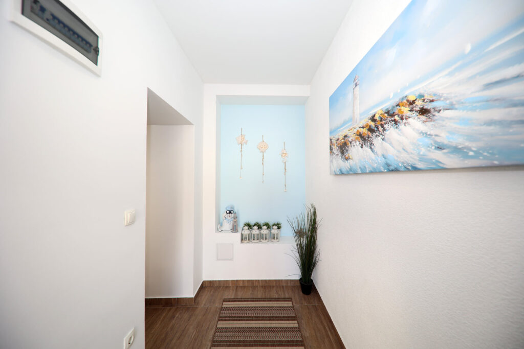 Apartment B1 is located on the first floor. It has access directly to a large covered sun terrace across a spacious hallway with marine decoration. This apartment also has a separate bedroom with a built-in wardrobe, a bathroom with a shower and a toilet, and a sofa bed in the living room, where there is also an equipped kitchen with a large refrigerator.